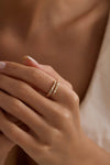 Zarafetin modern yorumuyla tanışın: Aria Ayarlanabilir Yüzük. 925 ayar gümüş üzerine altın kaplama olarak tasarlanan bu parça, geometrik kesim taş dizilimiyle hem minimal hem de dikkat çekici bir duruş sergiliyor. Ayarlanabilir yapısı sayesinde farklı parmaklara kolayca uyum sağlar. Günlük şıklığınıza zarif bir ışıltı katmak ya da özel günlerde stilinizi tamamlamak için ideal.